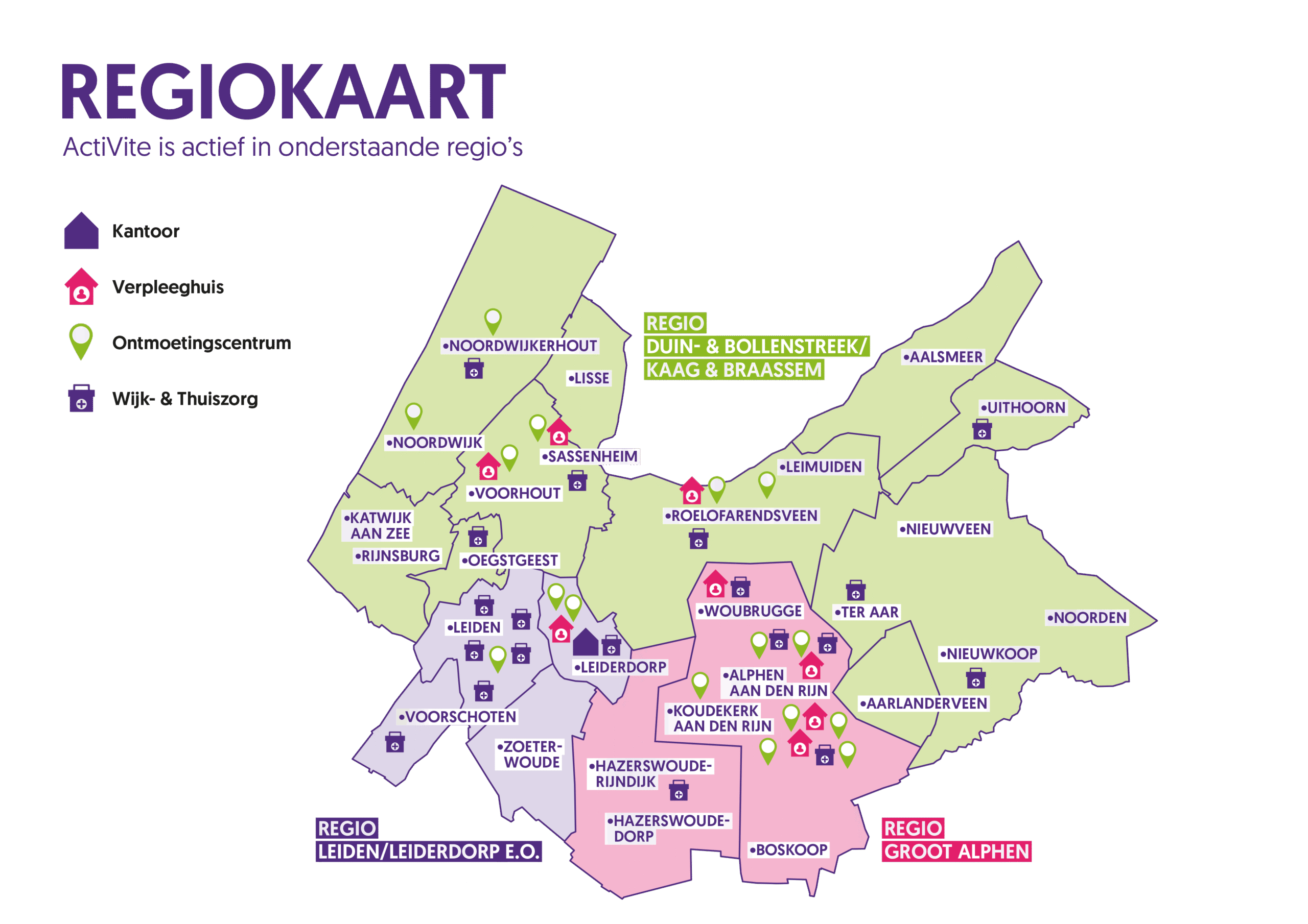Het werkgebied van ActiVite is groot. Hierdoor kun je altijd dicht bij huis werken als je dat wilt. In de thuiszorg, in een van onze 8 verpleeghuizen of op ons kantoor in Leiderdorp.